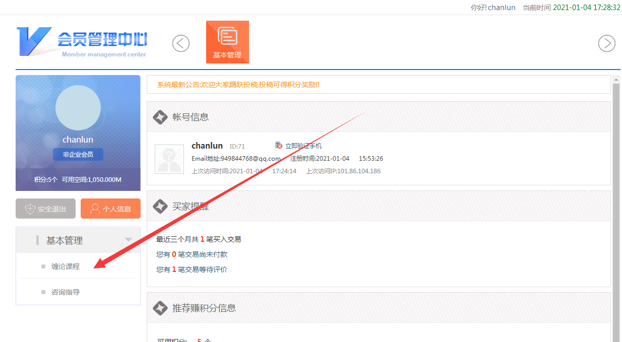 四、注册成功后,会自动跳转到主页。需要看个人的会员中心,请点击主页里账户名旁边的“会员中心”进入个人中心页面